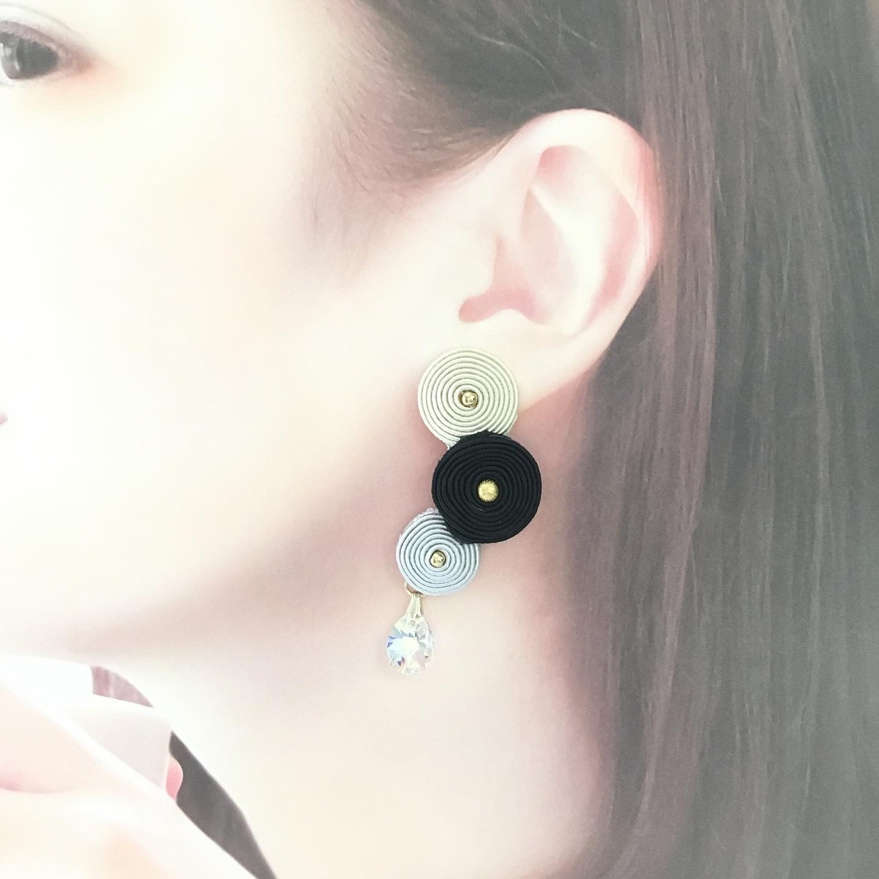 材料:レーヨンコード メタルビーズ 真鍮(ピアス金具はチタンポスト) ガラスビジュー 合成皮革